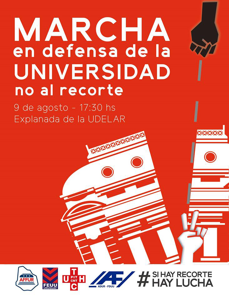 Nos manifestamos en contra del recorte del presupuesto de la UDELAR que dejará a miles de estudiantes fuera de la educación terciaria, puesto que no se podrán eliminar los cupos al ingreso ni tampoco en las carreras, que golpea fuertemente a la investigación de nuestro país y continua sumergiendo los salarios de los trabajadores de nuestra Universidad.